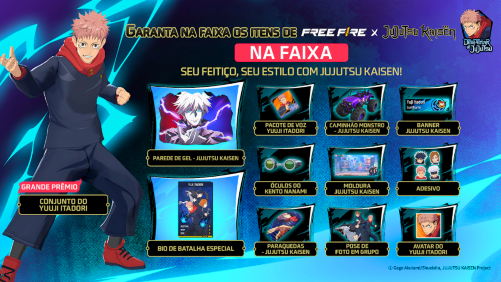 A coleção de feiticeiros está recheada de recompensas. O grande destaque é o conjunto de Yuuji Itadori, que será o grande prêmio gratuito do evento. Os jogadores também poderão adquirir skins temáticas como a Groza – Yuuji Itadori, Parede de Gel, skins de veículos e emotes.