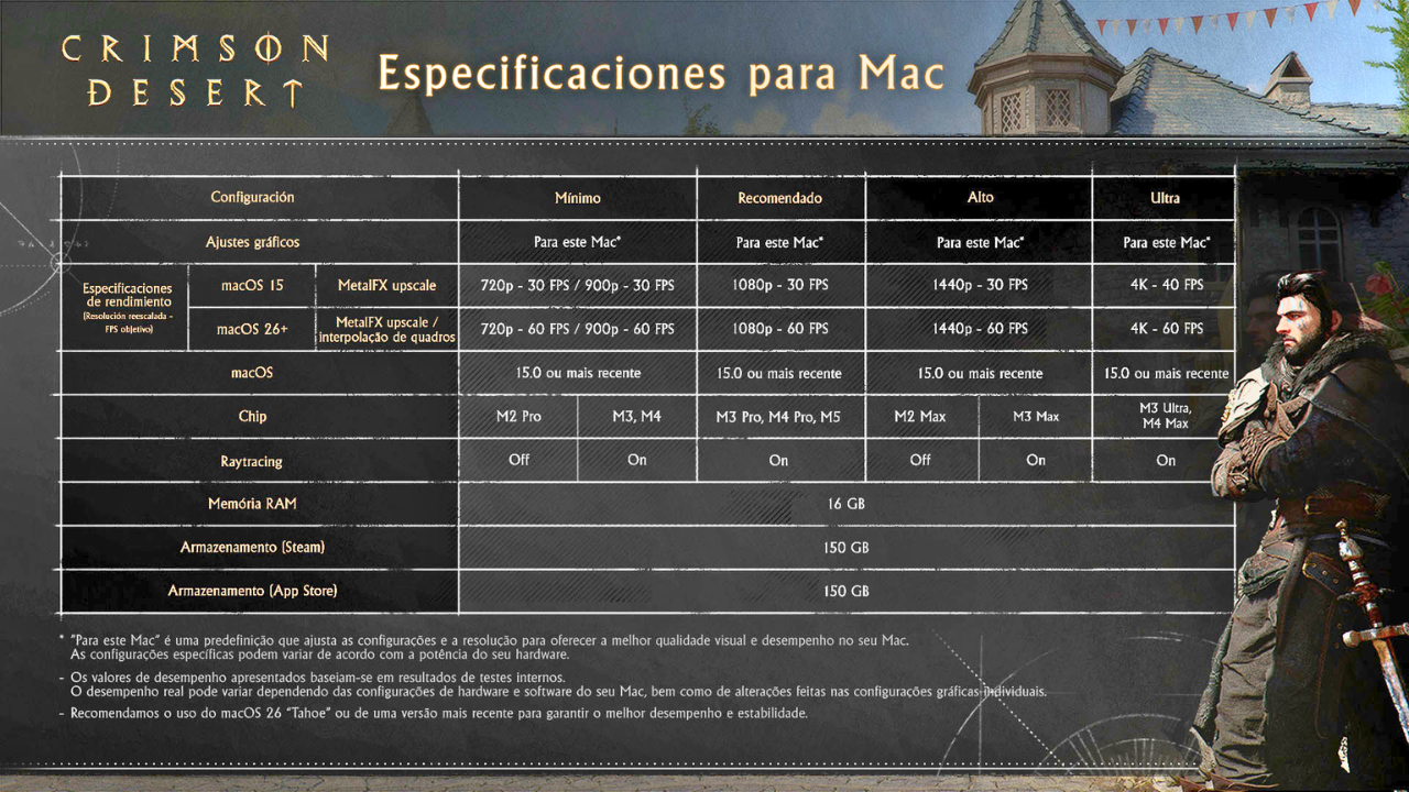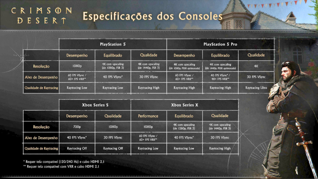 Com o lançamento mundial batendo à porta, a desenvolvedora sul-coreana detalhou como o jogo de ação e aventura de mundo aberto se comportará em diferentes plataformas. Crimson Desert utiliza um motor gráfico proprietário para entregar combates dinâmicos e cenários ultradetalhados, o que exige um hardware minimamente atualizado para garantir a imersão. Confira a nossa cobertura completa de Crimson Desert.