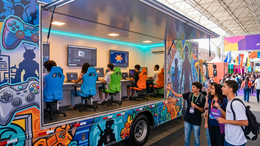 O que é: Um hub itinerante (caminhão adaptado) que oferece cursos gratuitos de criação de games.